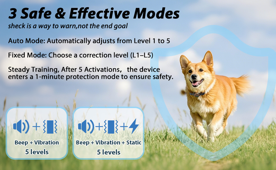 3 Collar Modes & 3 Training Functions:The dog shock collar offers 3 collar modes: Bark Control Mode, Dog Training Mode, All Mode. You can choose the appropriate mode according to your actual needs. The remote provides 3 training functions: beep(1-8 levels), vibration(1-16 levels), safe shock(1-99 levels) to help you train your dog indoors or outdoors.